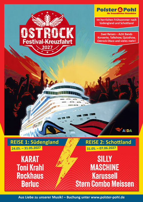 Polster & Pohl mit den Ostrock Festival-Kreuzfahrten 2027 das größte Ostrock-Staraufgebot, dass es je auf Kreuzfahrten gegeben hat. Auf zwei